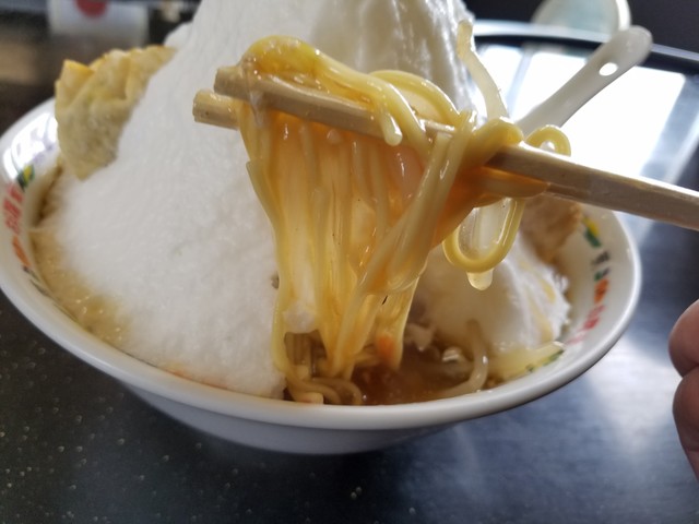 着丼と同時にとりあえず笑えます(笑) ラーメン丼の上に雪山のように真っ白な物体が約20cmの高さで乗ってきます♪