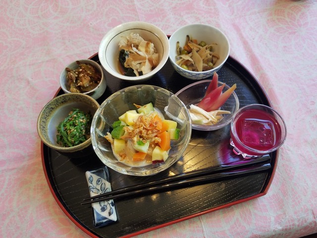 なかなかこういう料理って食べれないから、嬉しい限りです。 すごく優しい田舎の家庭料理ですね~。 小鉢は全部で6種あって、加えて紫蘇ジュースが付いてきます。