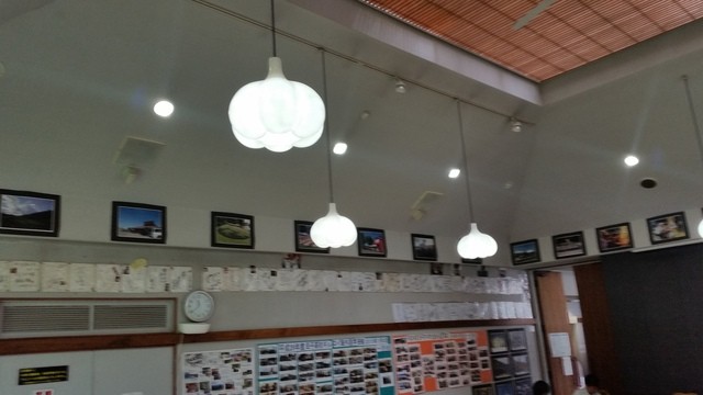 天井も高くて開放感があり、大きな窓からは緑がたくさん見えてホッと落ち着きますね~。 天井からぶら下がっている電球の傘までニンニク型にしているのは驚きました。