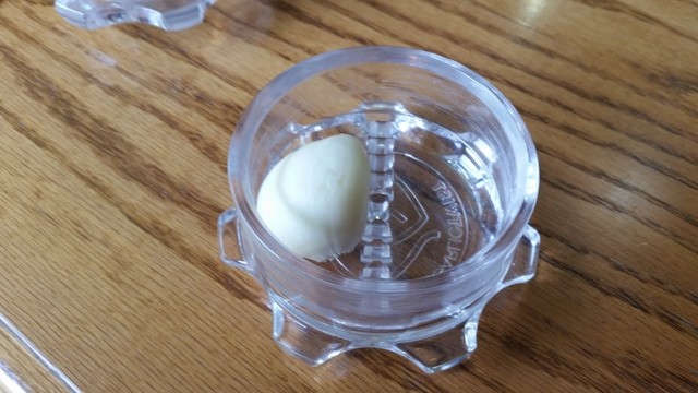 皮を向いて、中に入れてゴロゴリっと回すと中でクロスカッティングされて、キレイなみじん切りが簡単にできました♪ なかなか面白いサービスですね、ニンニクのみじん切りをちょいちょい付けながらのニンニク料理です。