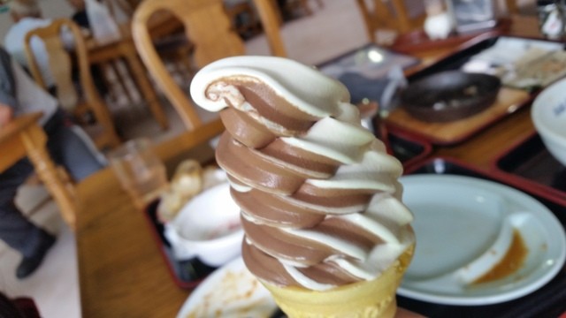 「にんにくソフト 白・黒ミックス (300円)」 バニラのところは白ニンニク、チョコのところは黒ニンニク♪