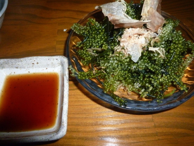 摘みたて新鮮な海ぶどう、いいですね~。 なんかプチプチとした食感とあっさりとした風味で、最初の一杯に最適な「とりあえずメニュー」だと思います。