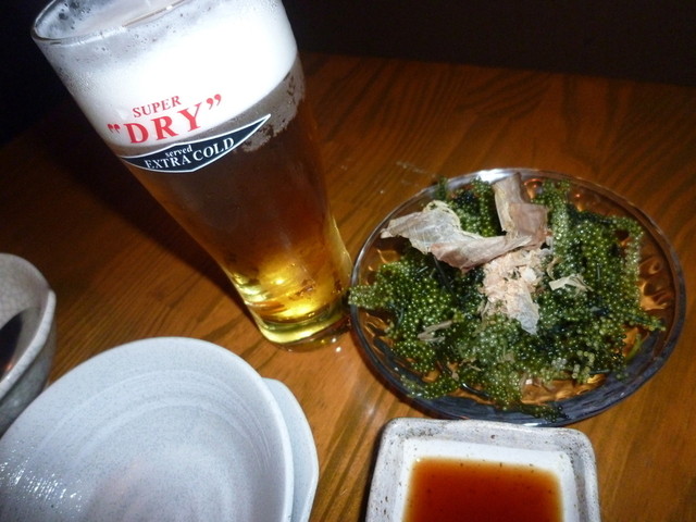 まずは、エクストラコールドで乾杯。 おつまみに「海ぶどう (580円)」から。