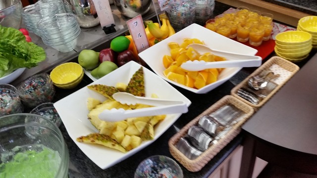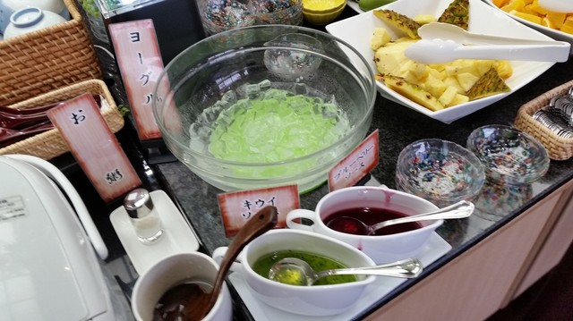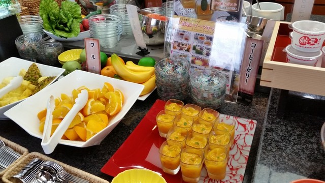 「フルーツ」もパイナップルやオレンジなどたくさん。 ヨーグルトにはキウイソースやブルーベリーソースが用意されていて、デザートも十分♪ コーヒーゼリーもおいてありました。