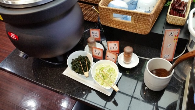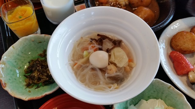 こちらでは、春雨・豚肉・キャベツ・もやし・きくらげ・小エビ・ニンジン・タケノコ・ウズラの卵などの具が入った器が並んでいて、スープをセルフでかけて持っていきます。 スープは、あっさりとした鶏ガラのスープでした。 さっぱりしていて、野菜も春雨もたっぷりなヘルシーな料理、朝一番で優しく胃を起こすにはちょうどいい料理ですね~♪