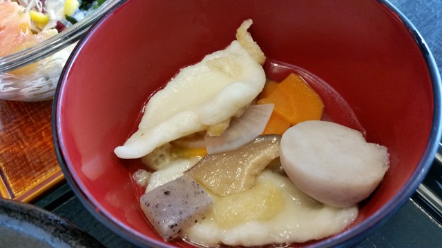 出汁は昆布やカツオ、イリコあたりの純粋な和風出汁で、具材の旨みがお汁に染み渡っていて、素朴なんだけど美味しい~♪ ほっこりとして心に染みる味わいでした。 団子はむっちりと歯ごたえがあって、なんだか優しい味わいのお汁ですね~。