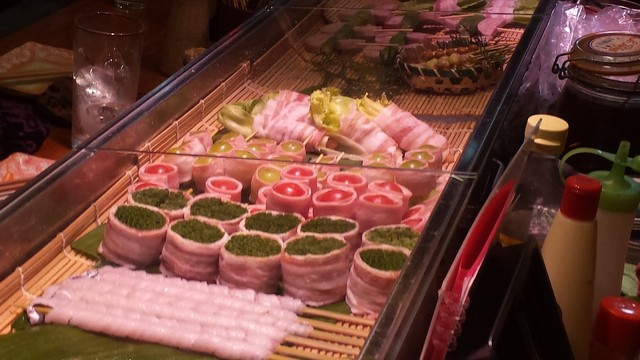 お店はいつも混んでいるようで、ボクが行ったときにちょうど2名分席があいたので、これはタイミングがよい!と思って飛び込みました♪ ケースには色鮮やかな巻串や貝串が並んでいて、見栄えもキレイで美しく、創作的な串もあったり、変わった串もあったりします。 野菜も魚も新鮮そうで、端から全部食べてしまいたいくらいの衝動に駆られますね。