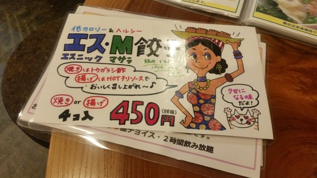 「エスニック・マサラ餃子」で、「エス・M」だそうです。 これは焼きor揚げが選べて、焼きは「トウガラシ酢」、揚げは「HOTチリソース」で食べます。 スタンダードなほうの「焼き」のほうにしてみました。
