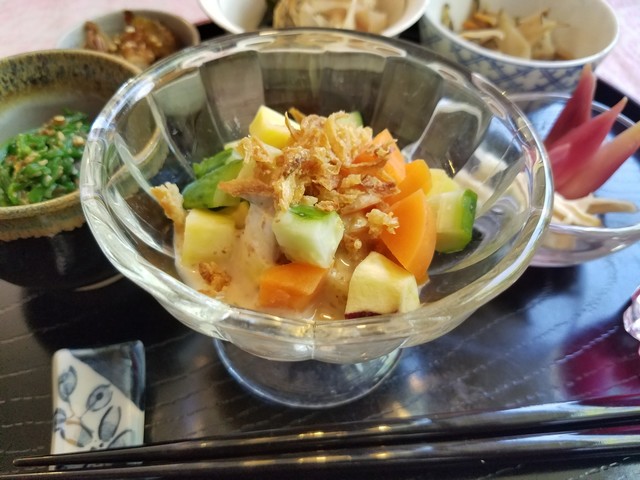 そんな中でお目当てだった「あんず茶屋ランチ (1100円)」は、週に2日のみで水曜日が肉料理、金曜日が魚料理と決まっているようです。 店主のおばちゃんも「野菜には絶対に他には負けない」と宣言してくれて、宣言どおりに次から次へと美味しい野菜を使った料理が登場しました。