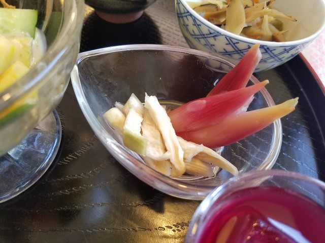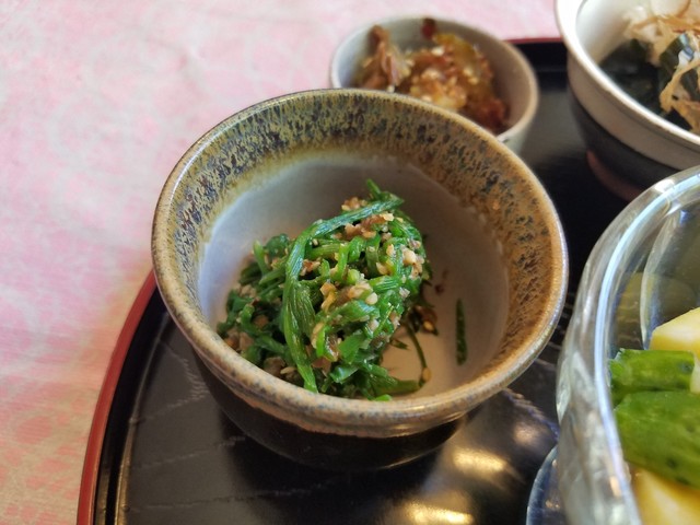 なかなかこういう料理って食べれないから、嬉しい限りです。 すごく優しい田舎の家庭料理ですね~。 小鉢は全部で6種あって、加えて紫蘇ジュースが付いてきます。