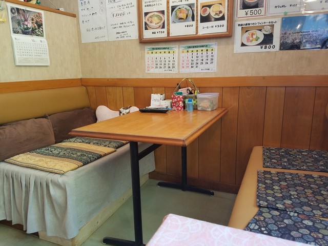 店内はテーブル席が、4名がけ4卓、6名がけ1卓、カウンターも2席ありましたが、いろいろと物が置かれているのでカウンターは使えなさそうな感じですね。 なんだか、椅子の座布団とかが手作り感があって、なんともホッコリと落ち着くお店です。