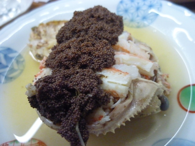 香箱ガニの中身を一旦蒸して、おでんの出汁で軽く煮たものだそうです。 ハカマにびっしりと付いている茶色い外子が山盛りに乗っていて感動します。 そして中のほうには、たっぷりのカニの身が適度にほぐされていて、オレンジ色の内子、そしてカニミソが入っています。