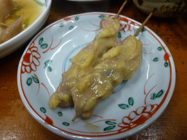 カウンター席で、ボクの目の前に焼き台が置かれていたのですが、まず目を引くのが端っこに山盛りに置かれている白味噌。 これが初めから気になって気になって。。。(笑) 注文すると、串にささった豚肉を焼くというか、煮てくれます。 時々、お湯を入れて味噌を割って味を付けていきます。 白味噌の甘さがたっぷりと染み込み、しっかりと煮込み焼いて、最後にコッテリと味噌をつけて完成♪ 見ているだけ、「これは美味しいだろっ! 間違いない!」とわかる感覚、豚肉が最高に美味しかったです。 うまく言葉で説明できないので、是非写真を一緒に見て頂きたいです。