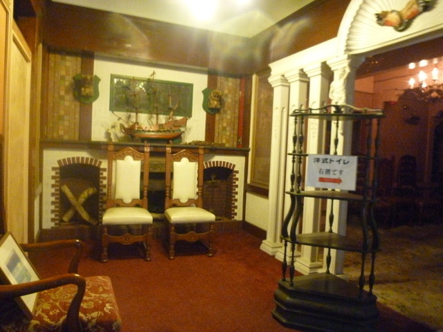 すごいというのか、和の空間の中に歴史を感じさせる洋館があります。 もともとはそこだけはフレンチなどをやっていたのでしょうけど、そこが今やトイレになっています。 最初、そこに入った時には洋館の独特な空気、歴史を感じる内装でドキドキしましたが。 案内は、「トイレは2階」とのことで、現在はステキな洋館のトイレになっています。