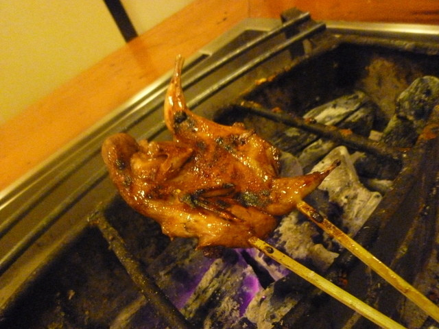 タレを何度も付けながら焼いていきます。 これが楽しい、そしてタレが炭火に滴り落ちて香ばしい香りが立ち込めます。 なんか職人さんになった気分(笑) うずらって独特のクセがある印象だったのですが、全くなかったですね。 これはもう骨までしっかりと焼いて、骨と身を一緒にバリバリと頂きます♪ くあぁぁぁ~、うまいっ!