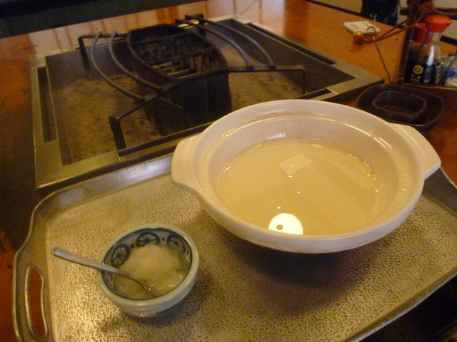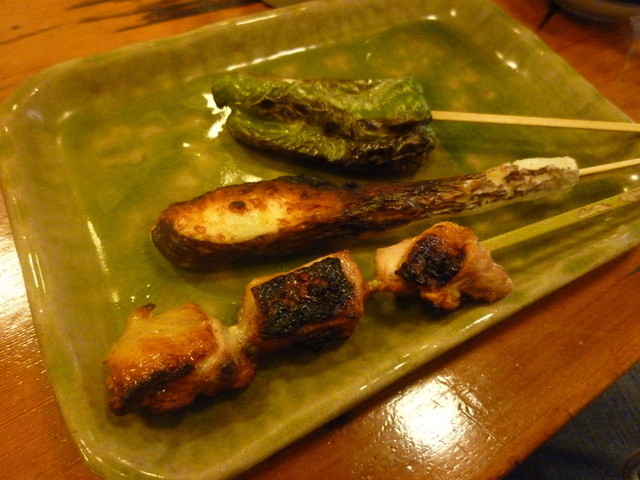 ひな鳥山さんの特製出汁に豆乳を混ぜて作った豆腐鍋ですが、これが最高に美味でした! これを食べに行くだけでも価値はありました。 最初にお通しがてらに囲炉裏の炭火の上で温めて頂きます。 濃厚でありながら、まろやかで飲みやすい豆腐の出汁。 温めていると「湯葉」が自然にできてきて、これまた最高です♪ 南大東島の天然にがりを使っているようで、ここに一つこだわりを感じます。 串焼きに入る前の前菜のような雰囲気ですが、名物料理の一つ! ほんのり、まろやかに体が温まります。 あ~、幸せ♪