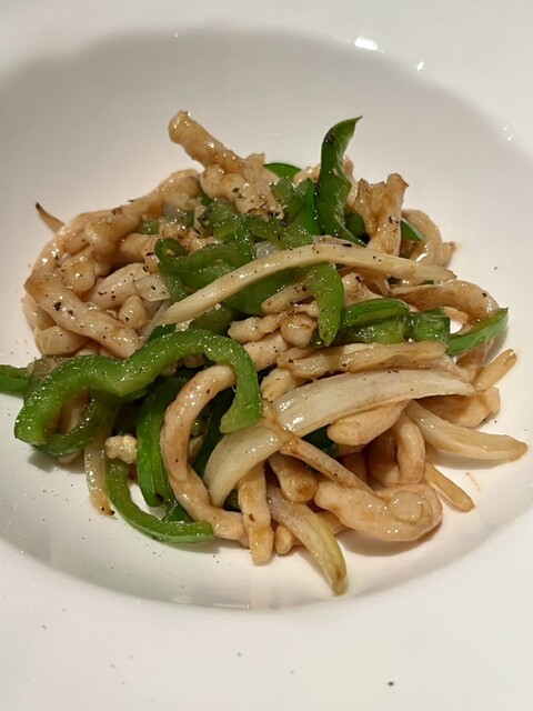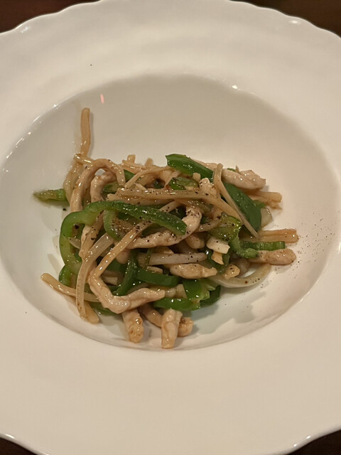 #前菜の盛合せ 筍 塩水にひたした海老 棒棒鶏和え 自家製焼豚 茄子の油淋ソース