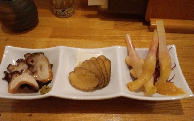 冬場の楽しみ河豚の白子。冬野菜が楽しみな野菜コースに、私は甘鯛@1300と白子@2000、いつもの連れは牡蠣@1100、冬でも大好きな穴子@1800を注文。