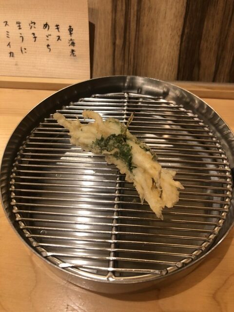 前回コメントで誓った通り、翌週さっそく裏を返しに。前回の話で羨ましがっていた家内を連れて。今回もお昼のコース6000円に、家内の大好物生うに、私はスミイカを追加。筍も追加しようとしたら、この日はコースに入っているということで。タラの芽やふきのとうなどの春の野菜が美味しかったのは言うまでもなく、筍も木の芽が挟まれていて優しい歯ごたえと上品な味。ウニは大葉で巻かれていて、絶妙な揚げ加減で中はレア。家内は大喜び。スミイカはしっかりした厚みがあったが柔らかく、甘みも感じるおいしさ。〆は二人とも天丼。天茶、天ばらでシェアしても良かったが、二人とも天丼譲らず!ハイボールにロック2杯、言わなくともチェイサーを出して頂けるのがうれしい。すっかり気持ちよく幸せな気分で大満足でした。今日は二人でお会計2万。うれしい高CPです。
