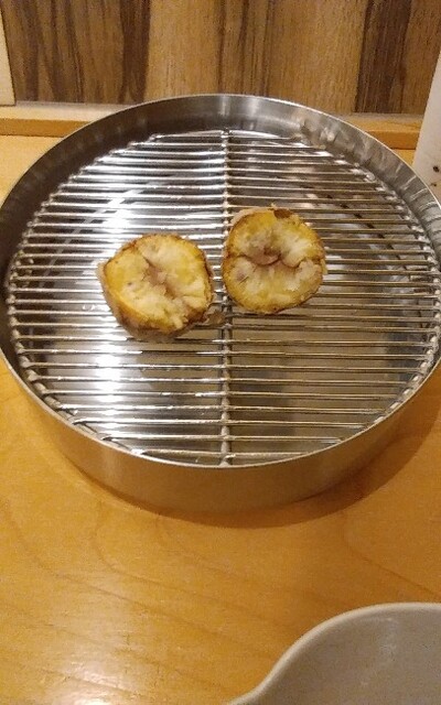 月1,2回ペースでお邪魔していますが、美味しいてんぷらで昼吞み出来ることの幸せをかみしめています。野菜コースが楽しみで行くのですが,秋はむかご、渋皮付き栗、銀杏などの顔ぶれに。@税込4500。銀座の乙な小料理屋などでむかご餅の料理は出てくることがありますが、そのままの天ぷらはここでしか味わったことがありません。ちょっとしたほろ苦さを感じる大人の味で楽しい。秋に獲れる希少な九州の水ナスも今回は登場。夏の泉州水ナスの瑞々しさとはまた一味違う食感と濃い甘味。冬にはどんな顔ぶれの野菜になるか、今から楽しみです。