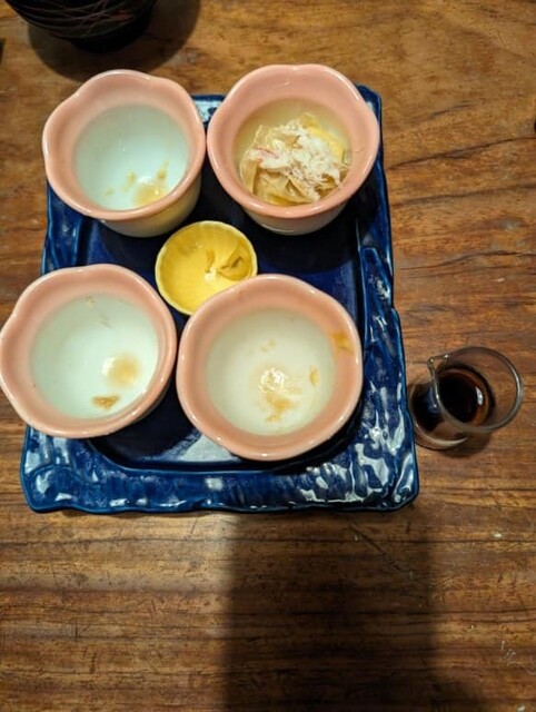 鍋をつつくのが苦手なので、カニちりが入っていないランチコース有明@4950を予約しておきました。仕切られた掘りごたつ座敷で周囲を気にすることなく蟹にむしゃぶりつけました。前菜はミニサラダ・ミニ茶わん蒸し・蟹爪。コースは湯葉蟹シュウマイ、蟹の天ぷら、カニ釜飯、赤だし。赤だしにも蟹の身が。湯葉蟹シュウマイがカニ身たっぷりで気に入ってしまって、追加注文@1100。コースでは2個でしたが、アラカルトだと4個きました。連れはジンジャーエール@330、私は芋金黒炭酸割@550でスタート。当然のごとく、コースだけではカニ食べたらず、炭火焼のタラバ@6600、ズワイ@3960を注文。焼いて持ってきてもらうか、自席で炭火コンロで焼くかを選べます。ゆっくり焼きあがる匂いを感じたかったので、テーブルで焼いて正解、香ばしい匂いが部屋に立ち込めました。写真忘れましたが、追加の蟹みそ@990もしっかりした旨味で、つまみにも、釜飯の上に乗せても美味しかった。2杯目は私は芋さつま司のロック@770、連れは生オレンジジュース@550。さらにタラバ脚1本@5280を追加。脚1本で食べ応えのあるタラバ大好きな連れはもう上機嫌でした。〆の蟹釜飯は固形燃料の卓上コンロで炊き上げるのに30分弱。蟹もちゃんと乗っていて、お茶碗2杯分あり、もう大満腹でした!