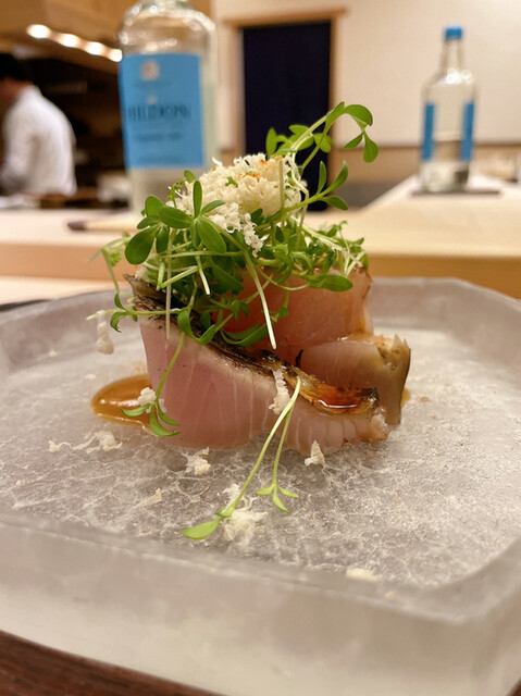 皮目は炙ってパリッと。細かいフレーク状の山わさびとクレソンのスプラウト、葛粉でとろみをつけたポン酢。