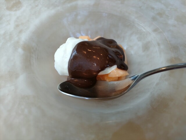 茨城県産の赤肉メロンとマスカルボーネ チョコレートソースとの説明が。