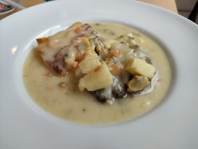 ソースはさらっと目、だけど貝の旨みがしっかり出ていてこれまた好きな味。野菜と貝と、じゃが芋かと思ったのは柔らかい肉厚の烏賊(多分紋甲イカ)でした。