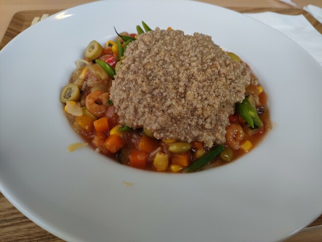 ・12種類の野菜と海老のパスタ 生姜風味の肉ソース