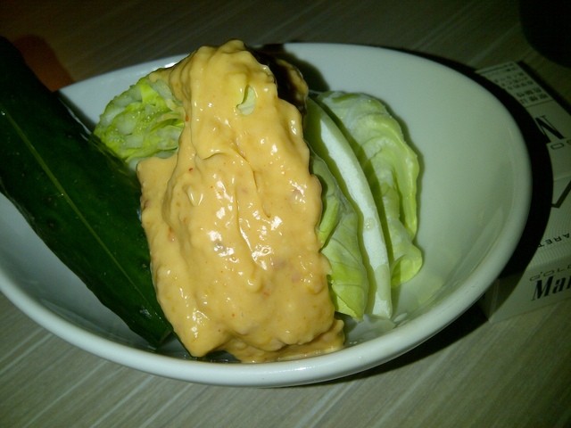 4分の1にカットしたキャベツとキューリに味噌ベースのソース。