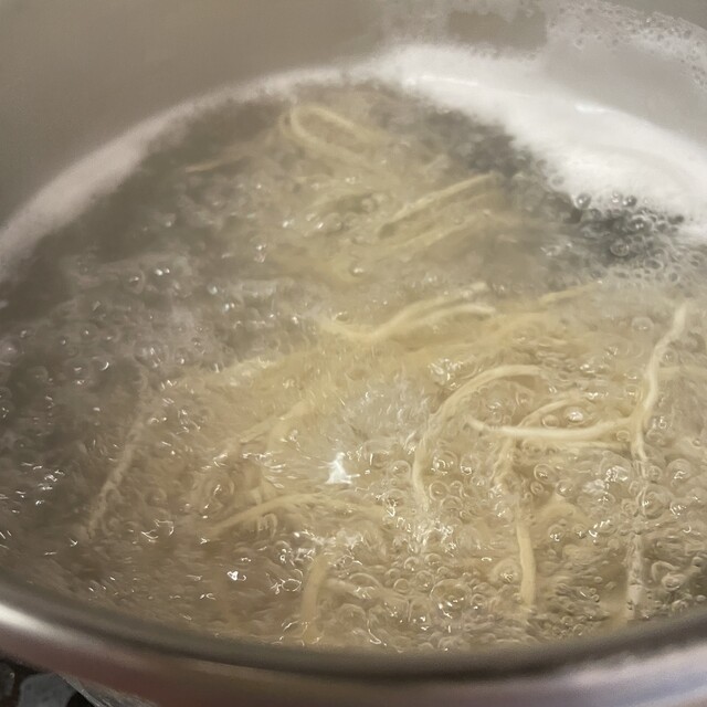 大きな鍋で3半、強めな火加減で茹であげた麺は
