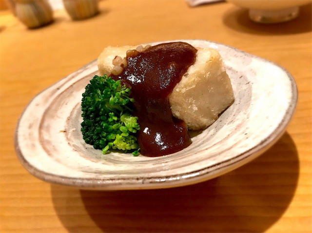 おめでとうございます!ということで、お祝い訪問。この後にもう一軒行かなきゃいけなかったので、5本のコース。まずは、前菜。ちょっとだけ火を入れた刺身。旨味がぎっしりです。おいしー。キノコの入った優しい出汁で、胃が活性化します。ビールをあっという間にやっつけて、南フランスのレオン・バレルとう作り手のふくよかな白ワイン。最初の串は、本来はレバーなのですが、痛風対策で替えてくれました。こちらはさがり。さがりだけだと淡白かも、ということで、腰のあたりの皮をのせてくれています。この気遣いがビブグルマン!モモです。こちらも絶妙な焼き加減。美味しいー!うずら。この火入れも絶妙!ここで、焼きリンゴが来ましたー。この変化球が嬉しい。これも火入れ難しいだろうなぁ。別で注文した鳥わさ。こりゃ、お酒進んじゃう。せせり。僕、鳥の部位で一番好きです!弾力と脂がたまらん!最後はつくねスープでフィニッシュ。この黄金のスープに溺れたい…ぷはぁ〜、美味しかった。かぼすのお酒で一息つきました。