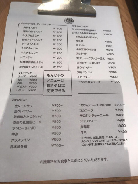 このグランドメニューの他に奥の若者テーブルのところに日替わりもんじゃのメニューがあります。