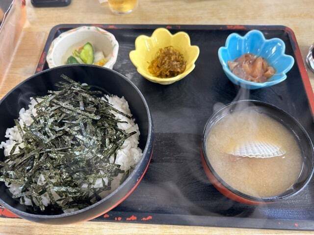 イカ塩辛、松前漬、お新香、ベビーホタテの味噌汁、海苔入りのご飯が定食セット。