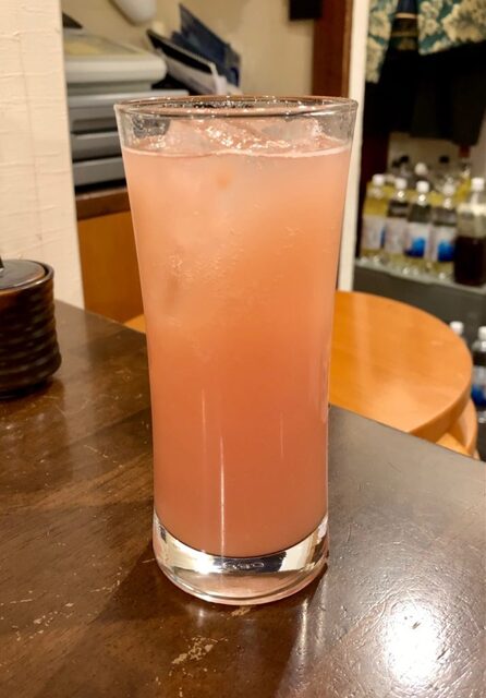 刺身盛り合わせ(一人前) ¥1,000:青ヶ島から届いた魚介の刺身を楽しむ。島唐辛子を醤油に入れて食べるスタイルを試してみた。刺激的な味になるが、舌が痺れるので要注意。一人前でも2人で十分楽しめる。ビールから「青酎”前割り”」¥680に切り替えて刺身と共に楽しむ。青酎独特の風味が実に良い。