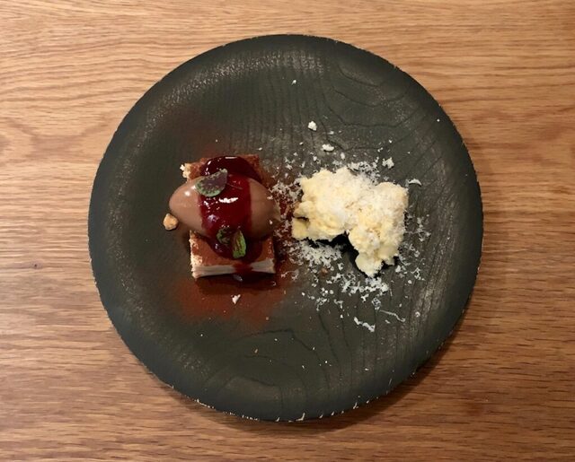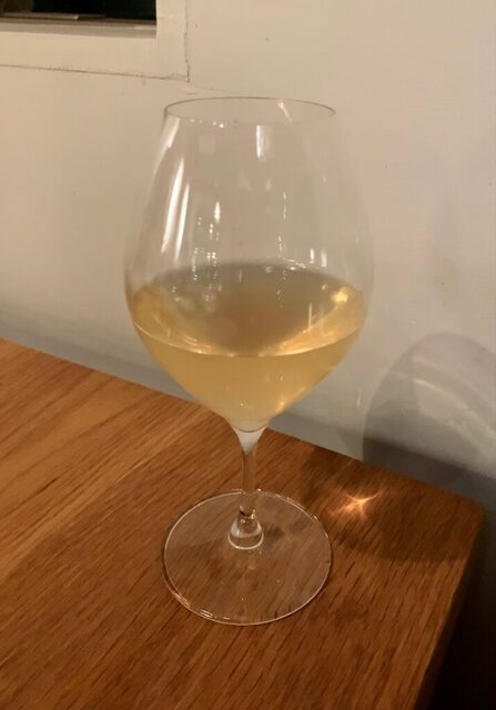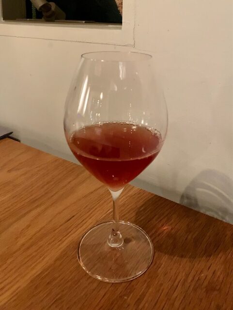 猪肉のハムとブッラータチーズに熟成ブルーベリーソース:かなり攻めている一皿がやって来た。菊芋の漬物なんかも添えて、熟成ブルーベリーソース、トマトのジュレソースも皿に乗ってまとまりが無い料理だが、何故か魅力的な料理に仕上がっていた。猪肉のハムも良い存在感でそこに鎮座していた。ここでピノグリのオレンジワインが提供される。旨味と酸味が心地好い良いワイン。