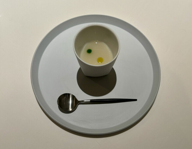 あやめ雪かぶのピューレ:まずは蕪の優しい味わいが楽しめる一品からスタート。緑のアクセントも楽しみながら野菜の美味しさを満喫出来る程好い濃さのピューレ。シャンパーニュに合わせる楽しさがあった。美しいバターと美味しいパンに合わせても良い相性。バターの美味しさは驚異的。