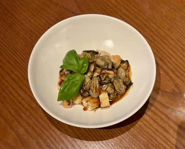 カキと揚げパンのニンニクソース:台湾料理らしい小さな牡蠣、揚げパンにニンニクの風味が効いた甘めのソースを合わせてバジルの葉を添えたもの。ニンニクはそれほど強烈な感じではないので食べやすい一品。ソースを吸収した揚げパンも美味しく味わえる。バジルの風味も非常に心地好い。力強い白ワインとの相性も良い。