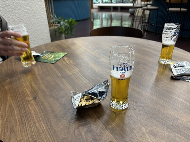 実際に飲んでみると、・・・、温度、泡、グラスの形状など非のうちどころがない。ただ、ツマミはナッツ系のみだったりして楽しみきれない。有料で構わないので、ツマミを提供してビールももっと飲めるようにしてくれると嬉しい。が、施設のコンセプト的にムリか。