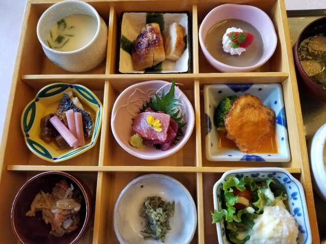 膳は3×3の升目箱とご飯、味噌汁、デザートつき