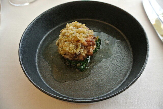 アミューズの一皿目は、リゾットとイカ竹炭の衣のクロケット、美味しいです。