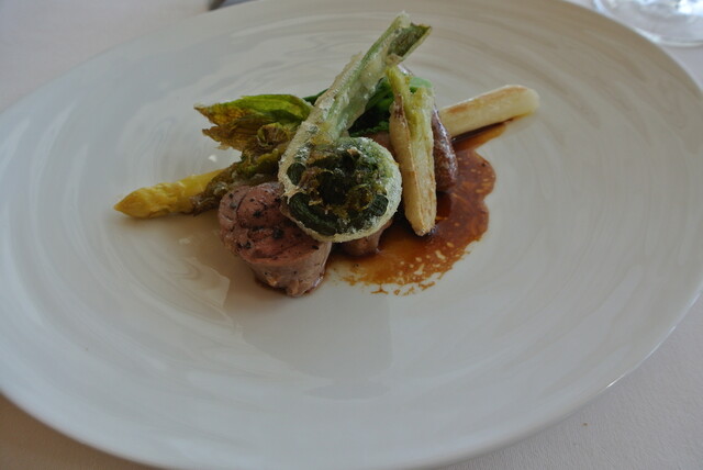 子羊のもも肉のロースト、ホワイトアスパラ、こごみ、タラの芽、蕗の薹のフリット