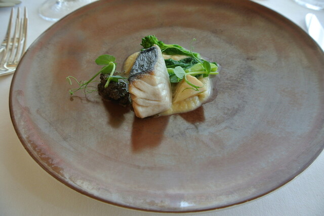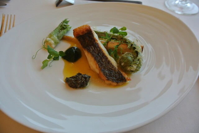 九州の鰆のポアレ、根セロリのピューレ、オリーヴとアンチョビ、