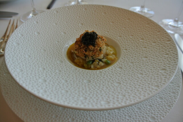 帆立にヘーゼルナッツをのせてやいたものを、つぶ貝のリゾットサフランソースの上にのせて、