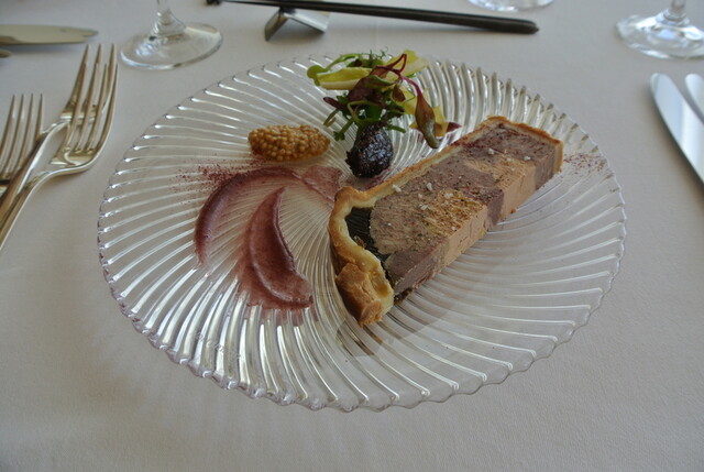 二品目の前菜は、帆立貝とズワイガニのフランにリースリングのソース、