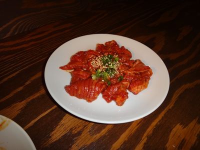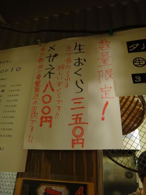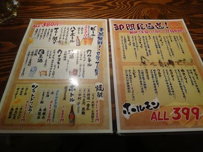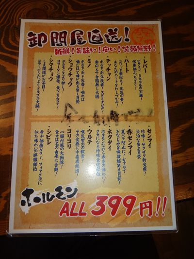 キムチ300円、シロコロ450円、てっちゃん・赤センマイ(各399円)、白飯220円