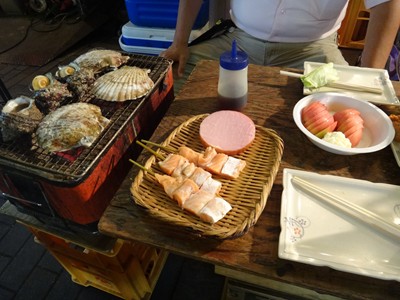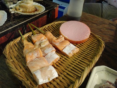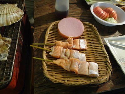 炭では、サーモン・ほたて・縞ホッケ・サザエと次々とBBQされてます。