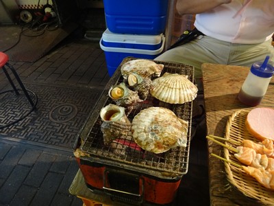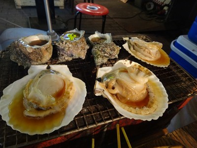 目の前の七輪で、手際良くホタテ・サザエと焼いていきます。