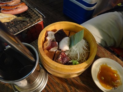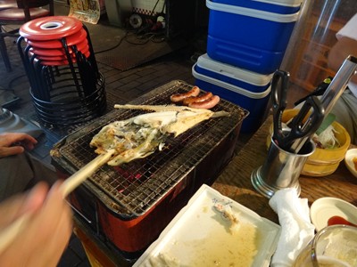 大人気の鮪のかまを外で焼いており、もくもく煙が目にしみる場所に着席です。