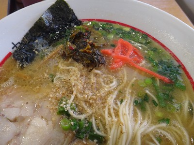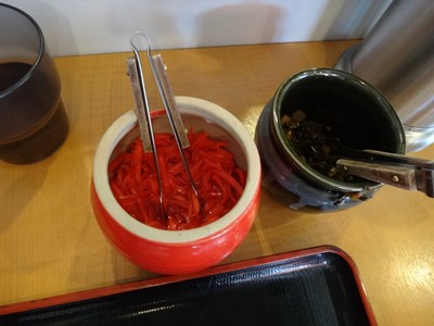 麺は、やや硬目。細いメンマに小さな海苔。半分くらい食べて卓上の紅しょうがと高菜で